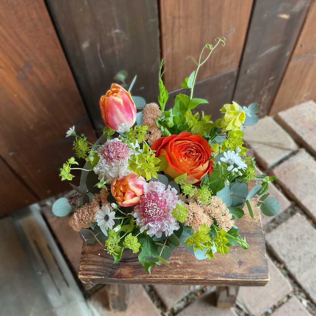 バラのアランチャにチューリップ.ベッドオブローゼス、スカビオサ.ストロベリーホープスクープ、セネシオ.ティアスノーブルーアイ、スターチス.ハニーアプリ、ブプレリューム、豆の花、ユーカリをお伴に♪