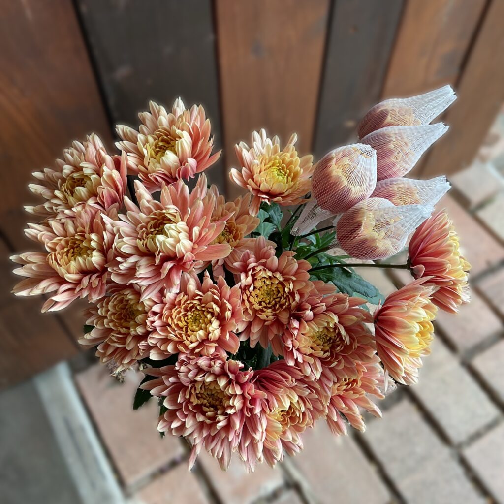 残りわずかとなっておりますが。。。素敵色のスプレーマム.エファサーモン♪お彼岸も近いのでマム達もお迎えしています♪