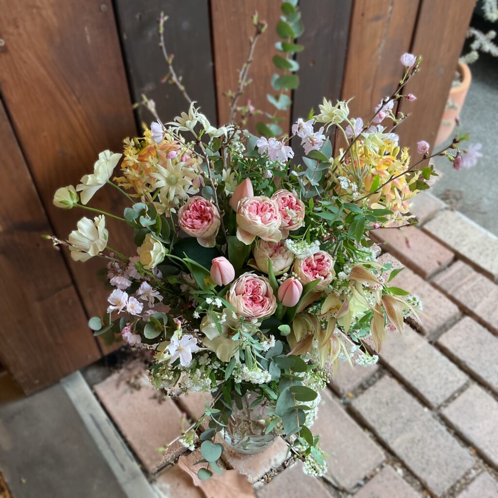 抱えるほどの大きなこちらのブーケには、スプレーバラ.ブライダルメープルローズにチューリップ.タイス、フランネルフラワー.フェアリーカスタード、ラナンキュラス.ラックスケラモス、シンビジューム.レイゲツ、エビデンドラム.ホノカ、紅彼岸桜、コデマリ八重咲き、ユーカリを束ねて。