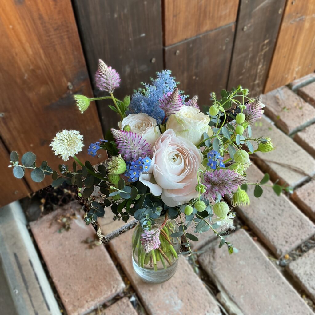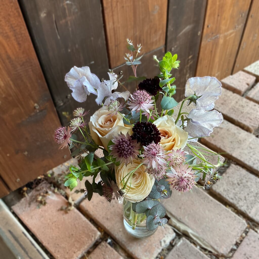 バラのブリュットにラナンキュラス.コルテ、アストランティア.ローマ、ヤグルマソウ.ブラックボール、スイートピー.ペールライラック、セリンセ、ユーカリを束ねて♪