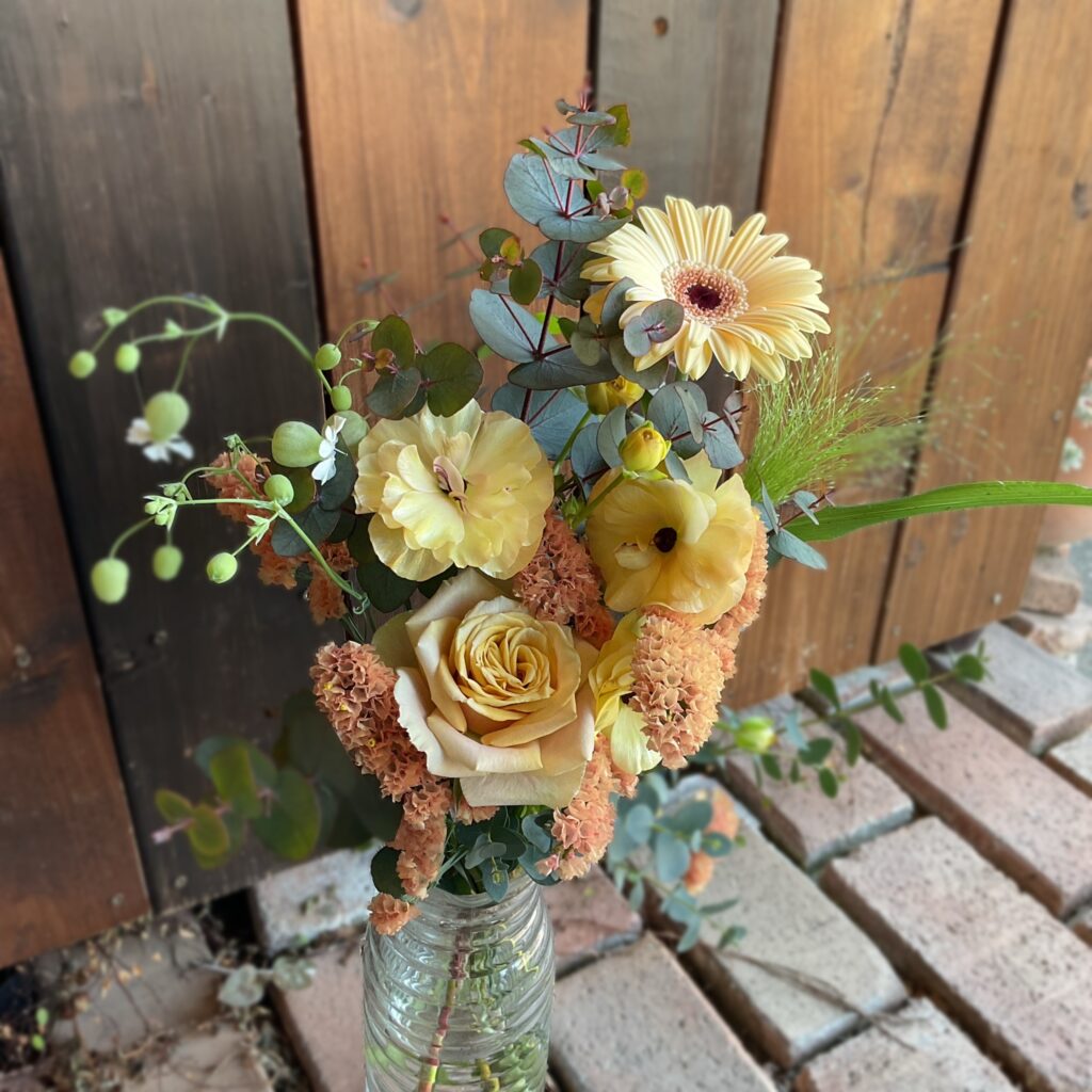 バラのサウザンドマイルズにラナンキュラス.ラックスベスタリス、ガーベラ.エルフィ、スターチス.ブリックオレンジ、シレネ.グリーンベルにスモークグラス、ユーカリを束ねて♪男性の方へ(^^)
