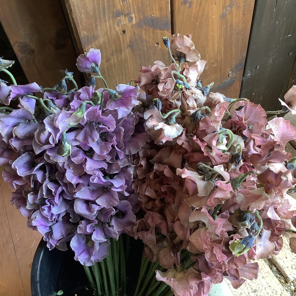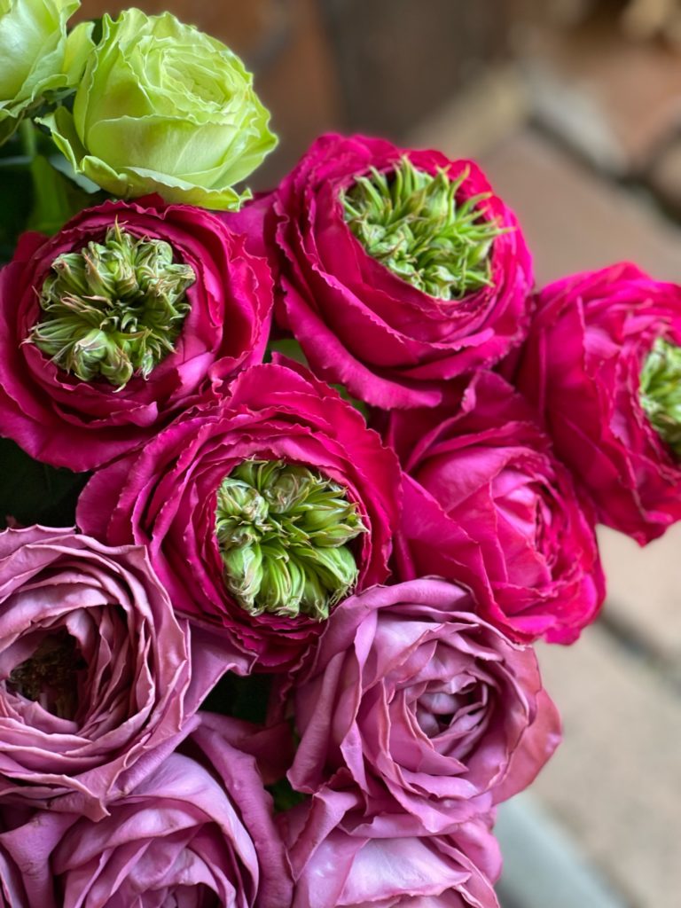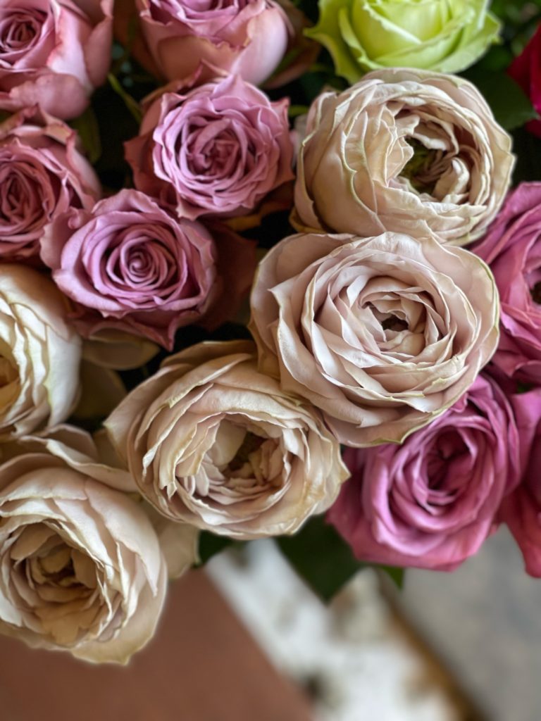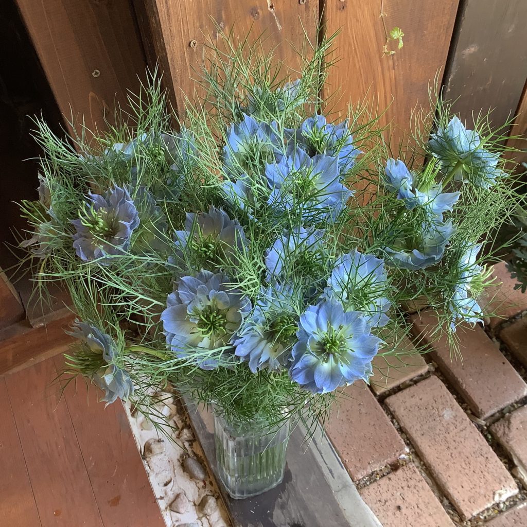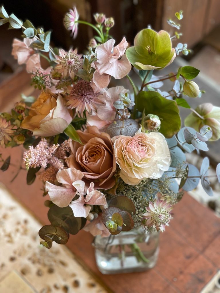 バラのシャドウオブザデイとポルトボナーをカラーやニゲラ.グリーンマジックやサクラコマチ、コデマリやユーカリと共に♪