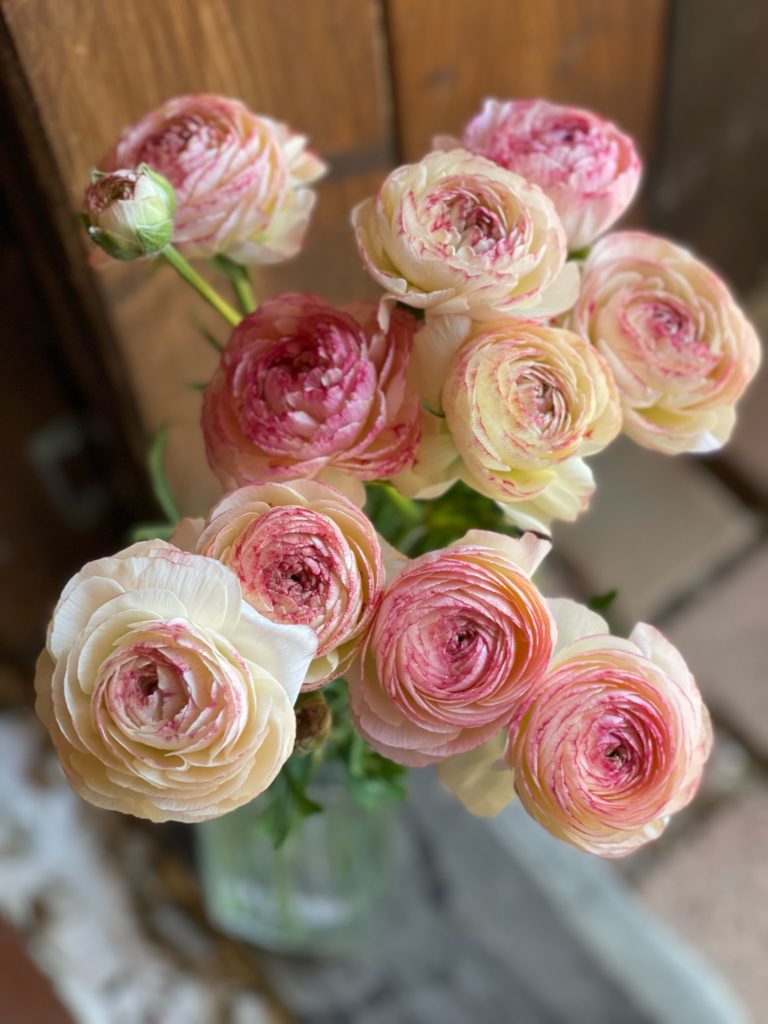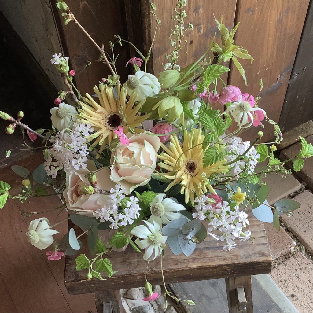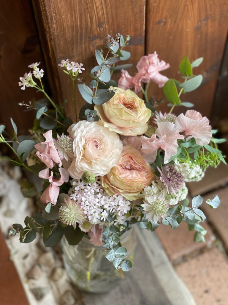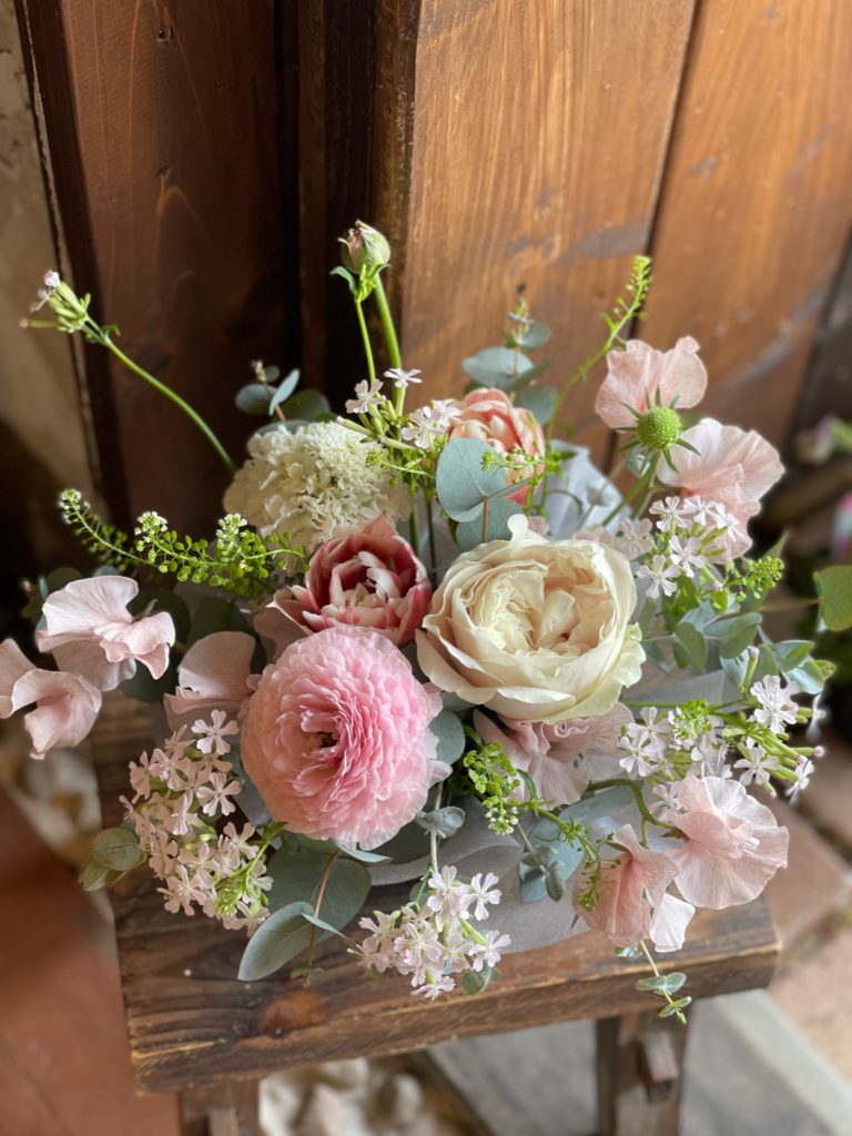 バラのポルトボナーにラナンキュラス、サポナリアにブルーレースフラワー、フランネルフラワーやルピナス、コデマリなどなど♪女性の方への贈りものに^^