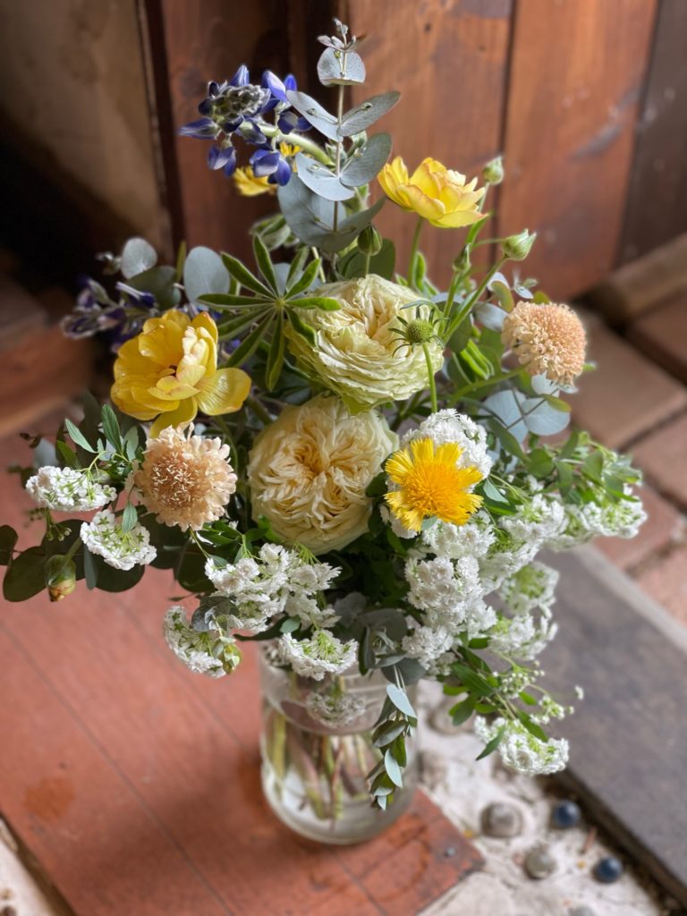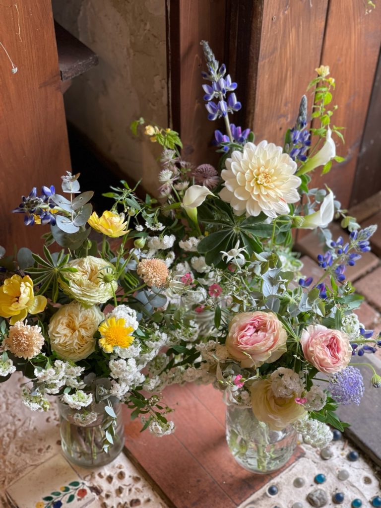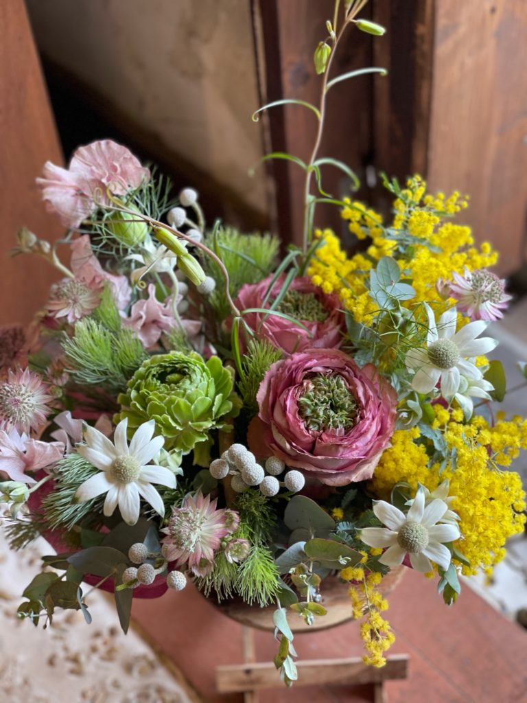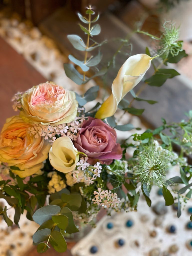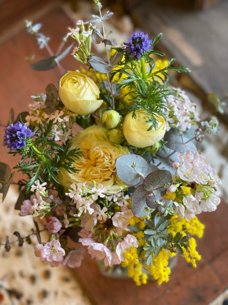バラのアブセントインスプリングにラナンキュラス.ラックスピュタロス、イエローサルタンにスカビオサ.アプリコット、ルピナスにコデマリ、ユーカリも♪こちらも男性の方へ^^