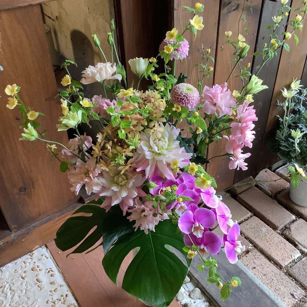 あたたかな春を優しい柔らかなお花達で♪ダリアのマルガリータやトルコキキョウ.ピンクサワー、マムやコチョウラン、エピデンドラム.ピーチピンクにヤマブキはバニラスターを♪