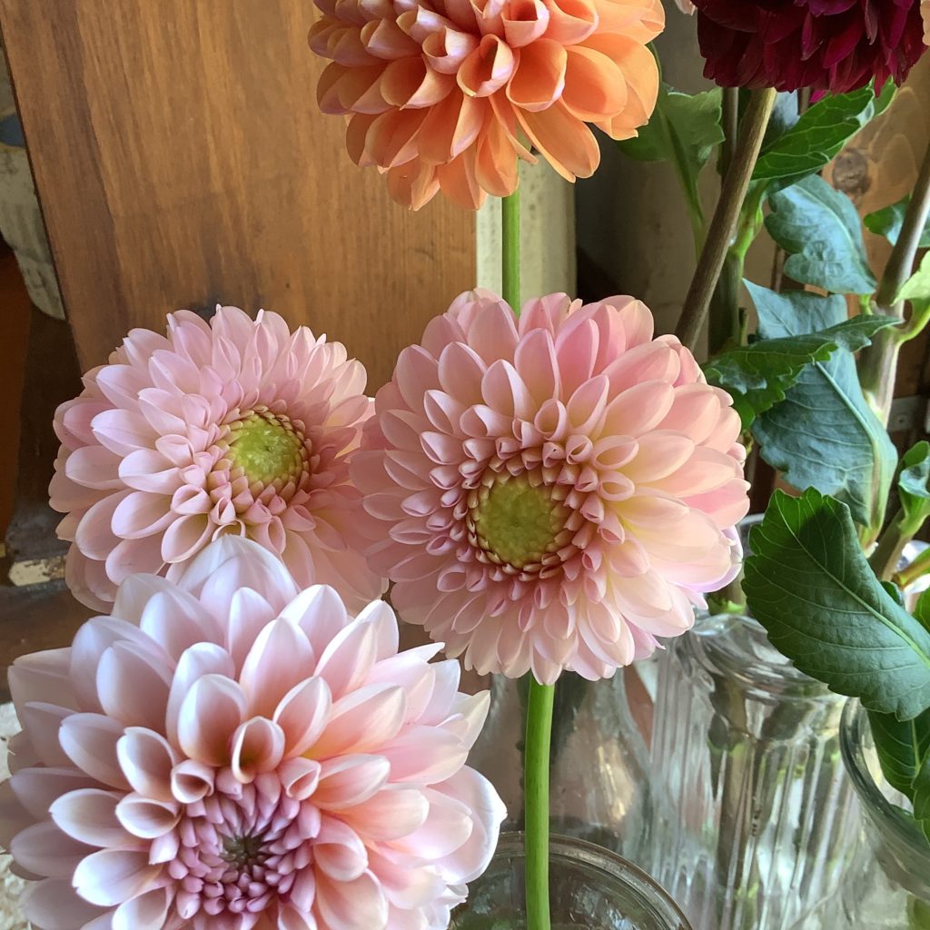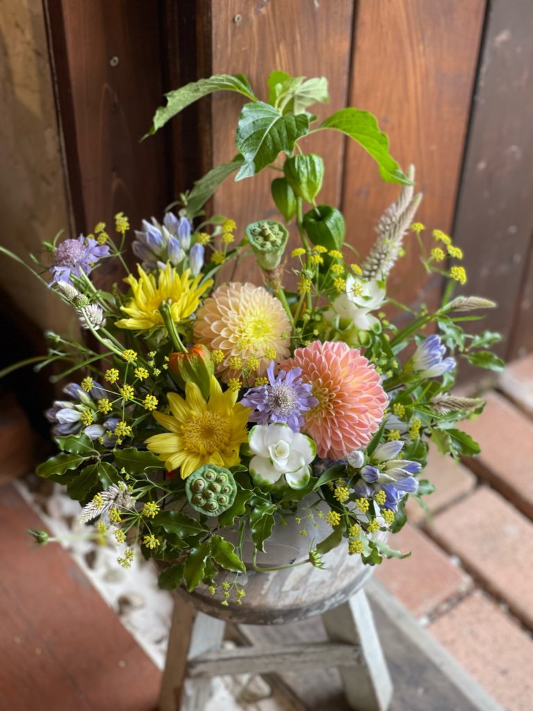 ご依頼をいただき、1番最初にお作りさせていただいたアレンジメントに出てもらっていたダリア達を♪ひまわりやクルクマ、リンドウ.パステルベルやマツムシソウ、セロシアにミシマサイコ、ほおずきも♪