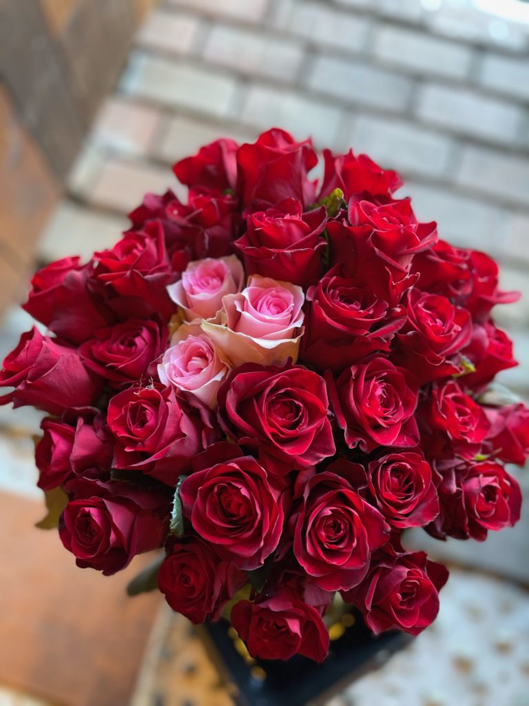 赤い子達をメインに艶やかに♪バラのレッドエレガンスやコチョウラン、トルコキキョウにスイトピー、蝋梅やアカシア、メラリューカなどなどを♪