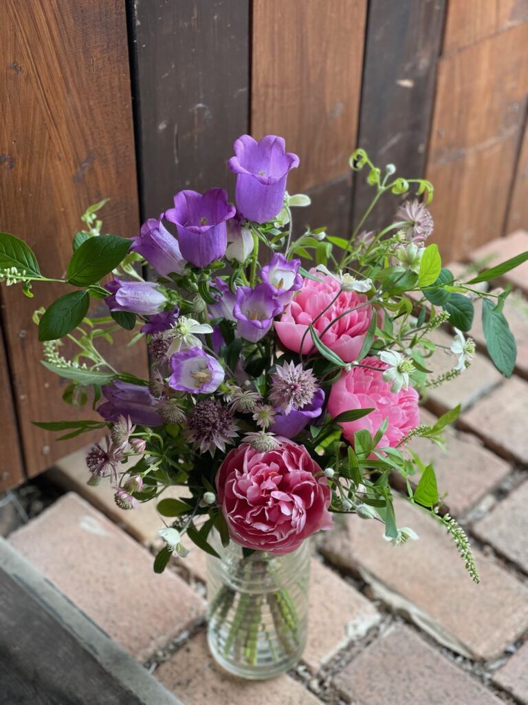 バラ.ジプシーキュリオーサにあるストロメリア.きなこ、ビバーナム.スノーボール、アリアム.ブルーパフューム、アスチルベにクレマチス、タラスピオファリムを束ねて。