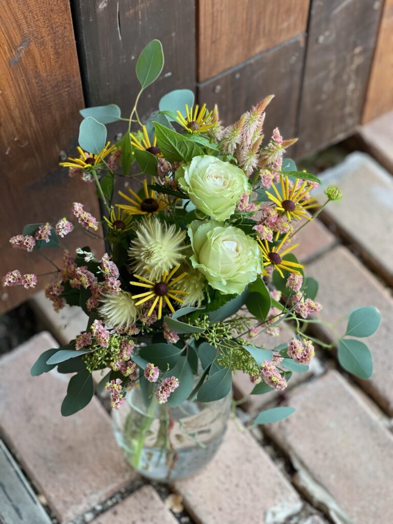 スプレーバラ.ティアモ、トルコキキョウ、シルバーキャット、アベリアにミシマサイコ、パールアカシアを束ねて♪