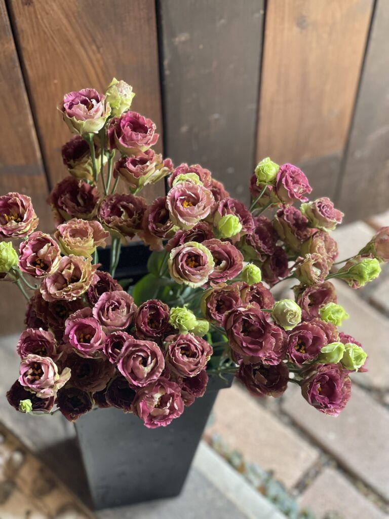 バラはアフタマス、トルコキキョウ.アンバーダブルショコラにセロシア.セルウェイテラコッタ、ミシマサイコに野ばらの実、ユーカリにチョウジソウ、テマリシモツケ.ディアボロ、スモークグラスを束ねて♪