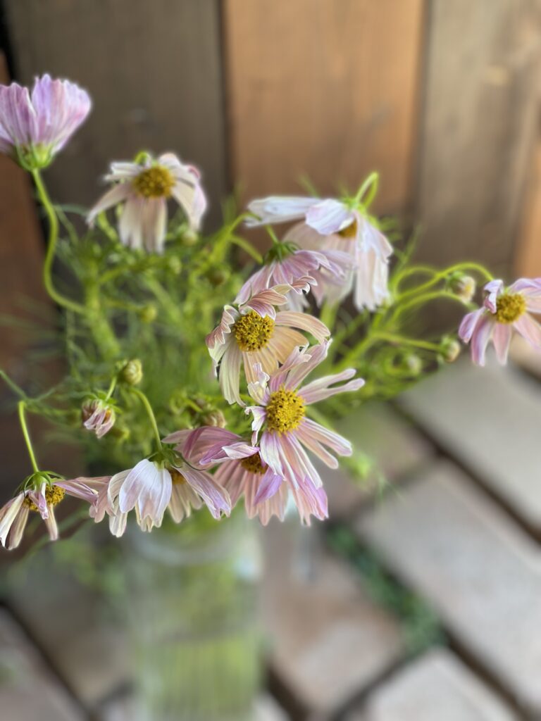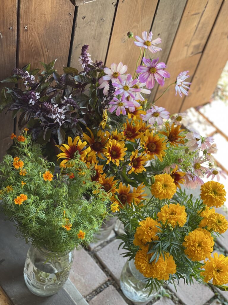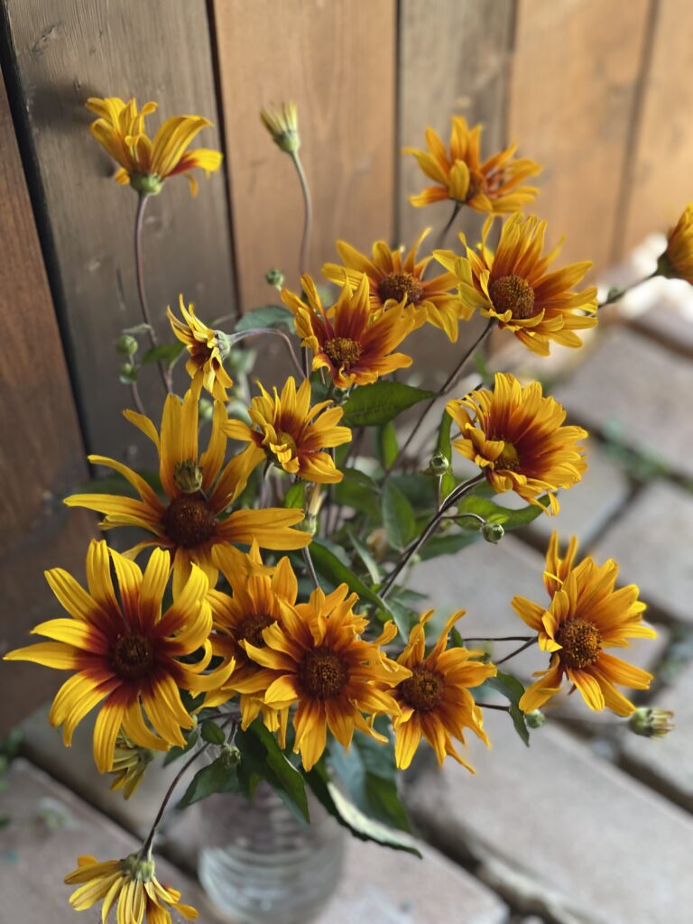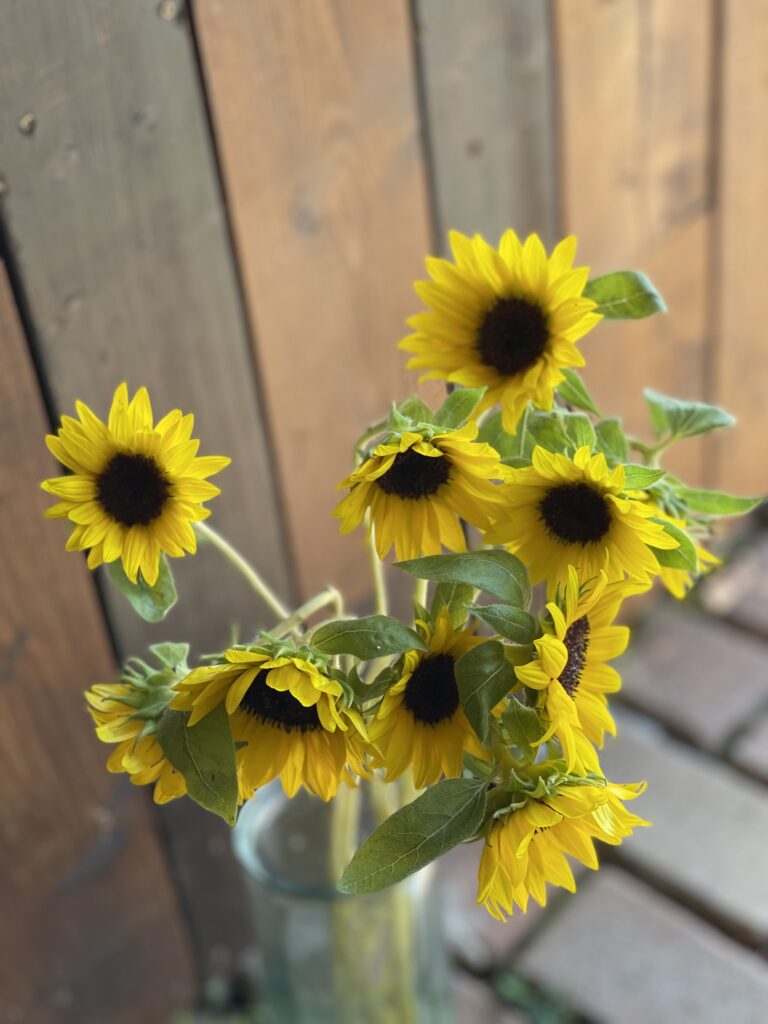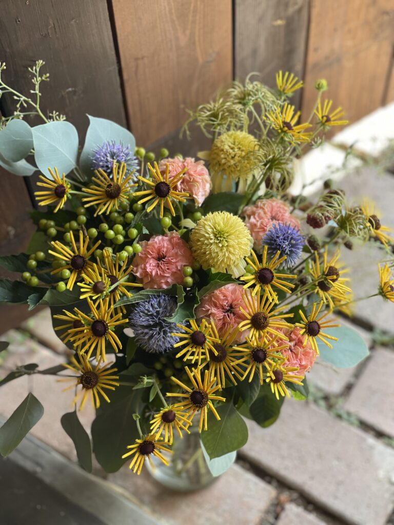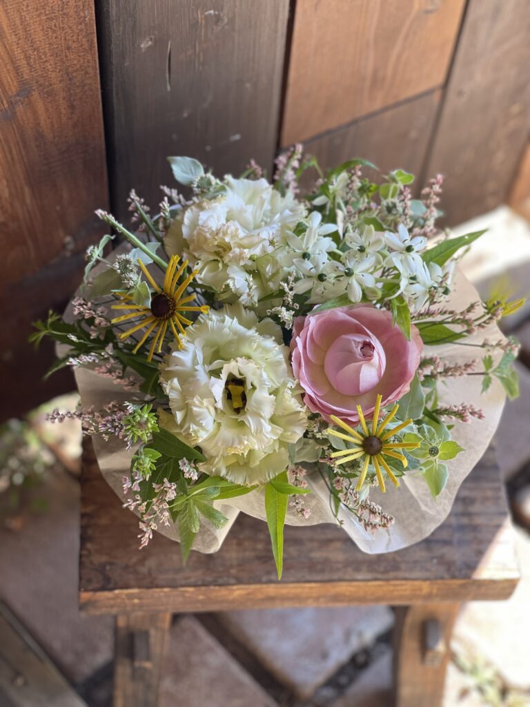 ひまわりのサンリッチライチやエキナセア.レモンアイビュー、トルコキキョウ.エグゼアンティークピンク、グレープフルーツミント、クレマチスシード、ビバーナム、チョウジソウ、ユーカリを束ねて。