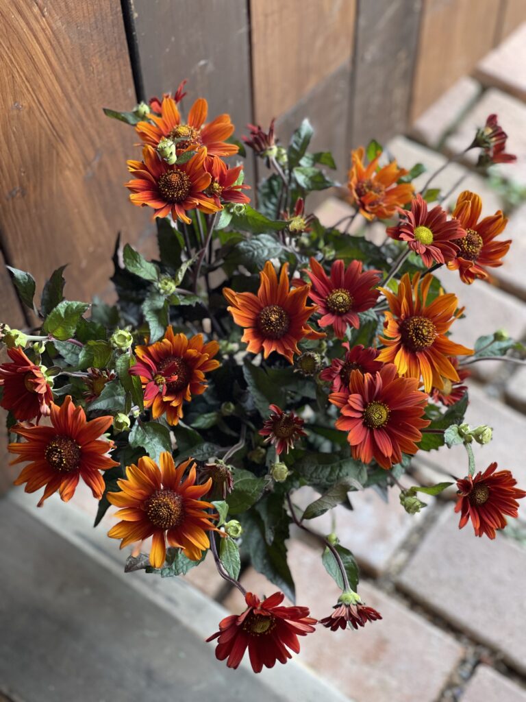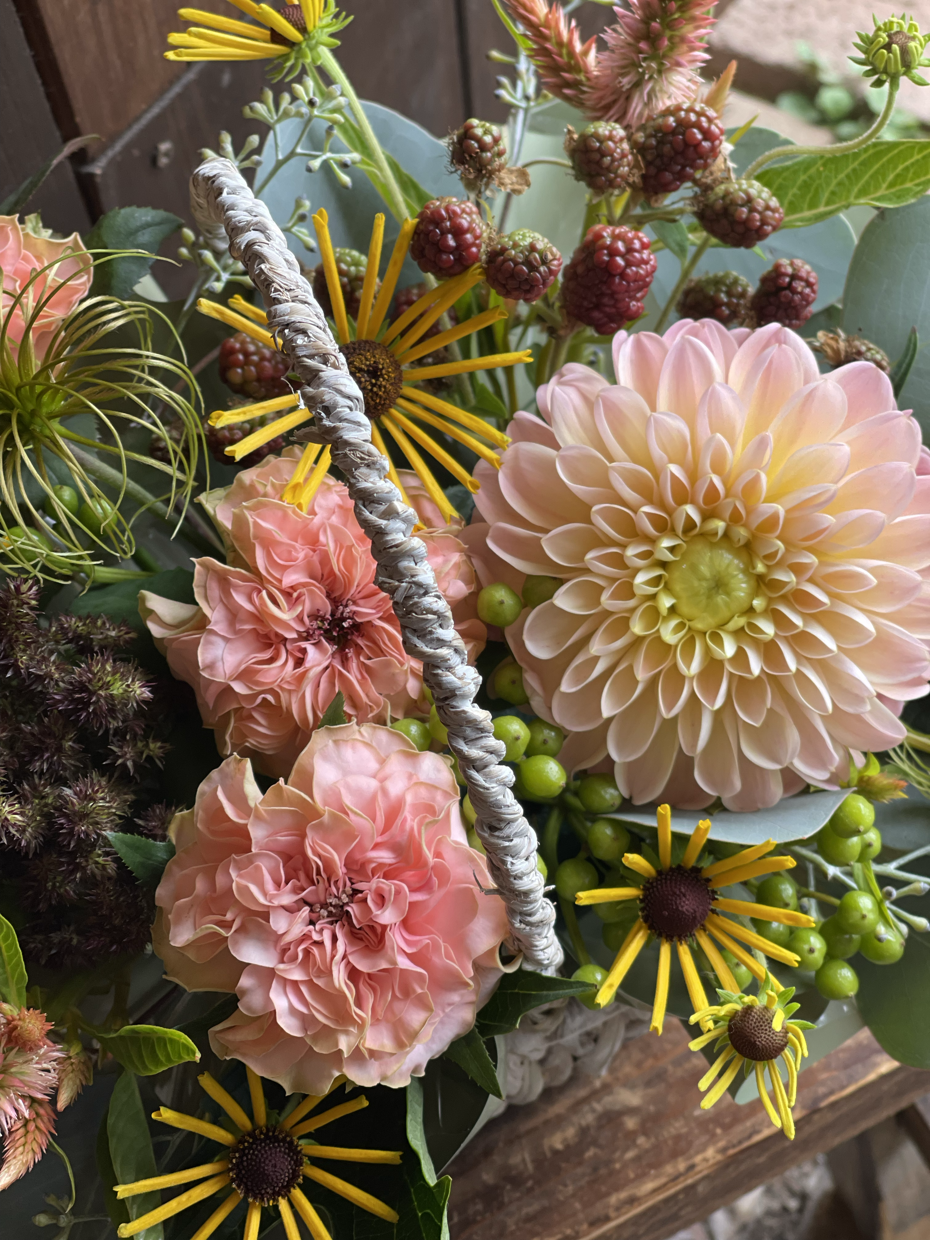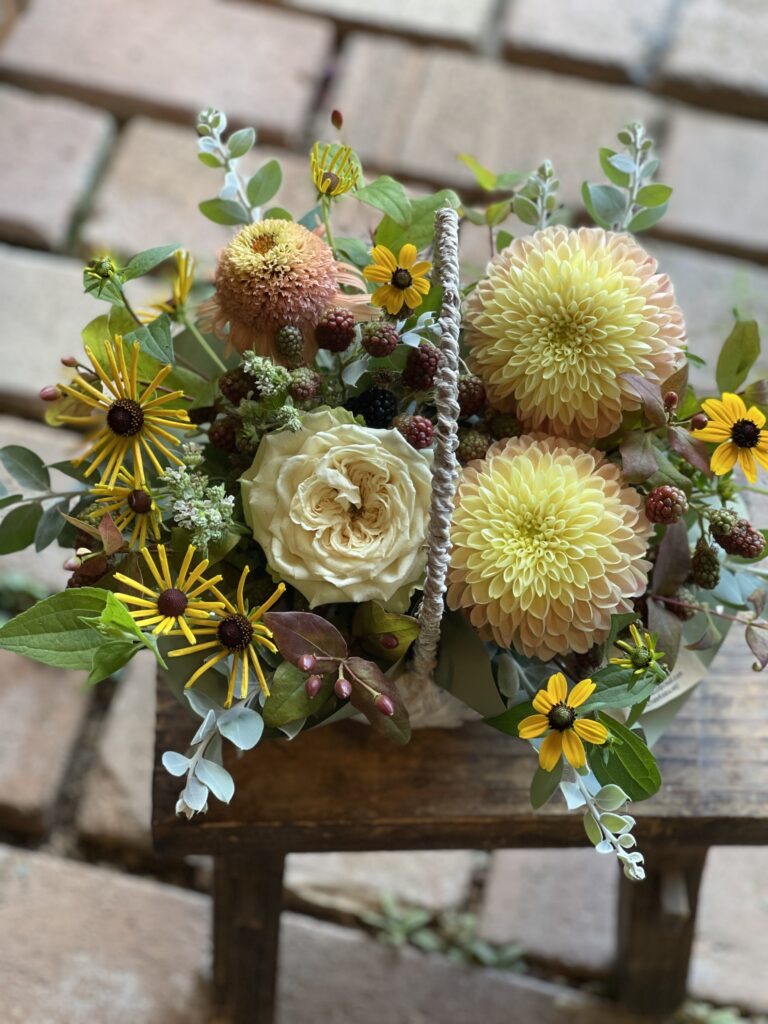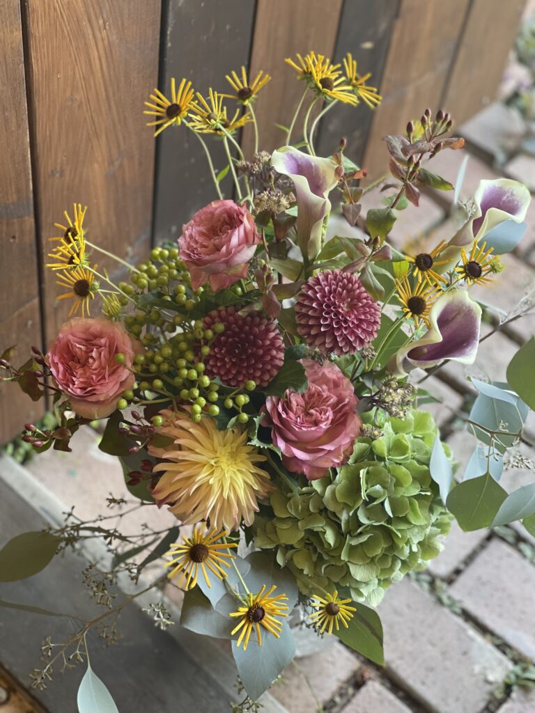 毎回出てもらっているバラはラロックを♪ダリア.ラッテにルドベキア.ヘンリーアイラーズ、セロシア.セルウェイテラコッタ、フロックスにクレマチス.ハッピーダイアナシード、ビバーナム.アルプスルビーグリーン、ブラックベリー、ユーカリ.ポポラスベリーをお伴に^ – ^