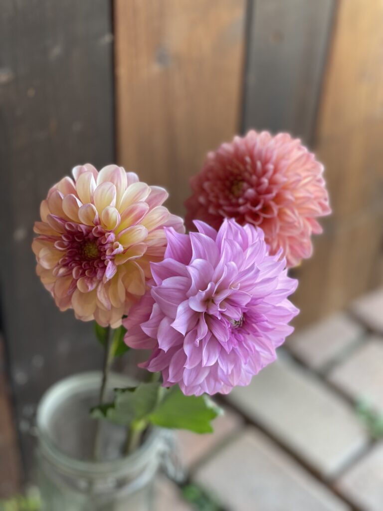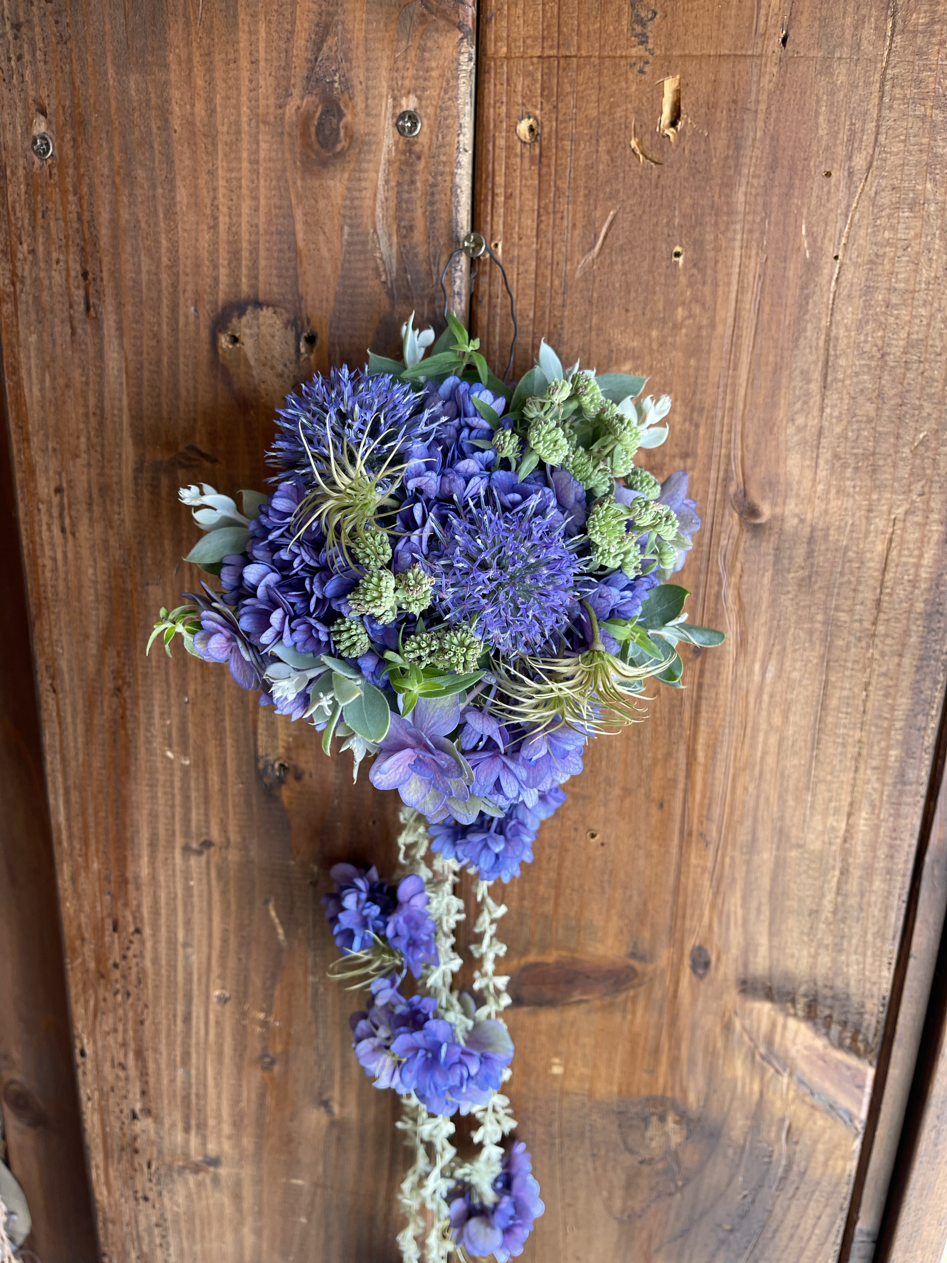 バラのラストナイトオンアースにダリア.ポリッシュキッズと名のなき美しい子、カラー.ピカソ、あじさい.ベレナライトブルーアンティーク、ルドベキア、セダム.パープルエンペラー、ビバーナム、ユーカリ、ヒペリカムを束ねて♪